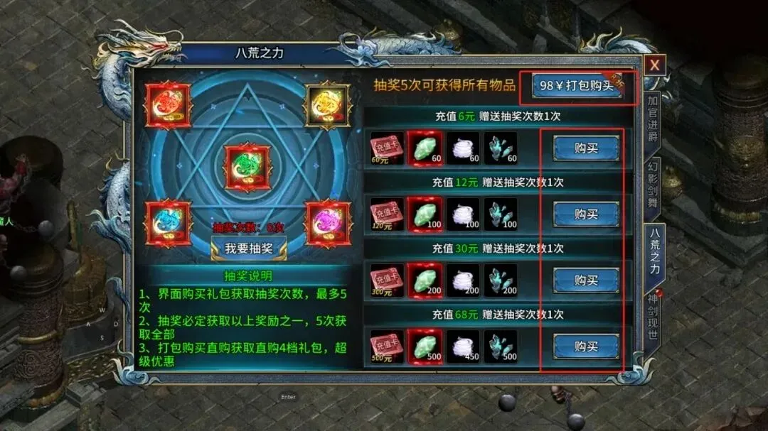 3. **八荒之力是关键**:98米一键打包全部八荒,获得超级BUFF(生命低于50%时自动回血50%),是百转万级前的必备核心。