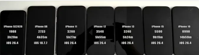 先说表现好的:iPhone 11 和 iPhone 12 这次提升很明显,是升到 iOS 26 以来最好的成绩。iPhone 16 也不错,比之前多了整整1个小时。