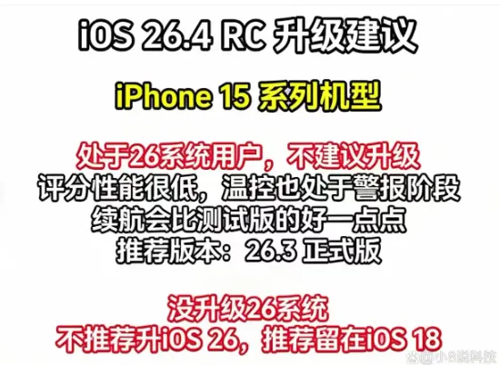iOS 26.4 正式版出来有一阵了,这次修复了34个漏洞,还加了不少新功能和细节优化。后台一直有人在问续航到底咋样,今天就把多款机型的测试结果整理出来,给大家做个参考。提前说一句,有款机型掉电挺明显的,往下看就知道了。-依旧没有14,因为测试者没有苹果14,要不你们给他寄一部?
