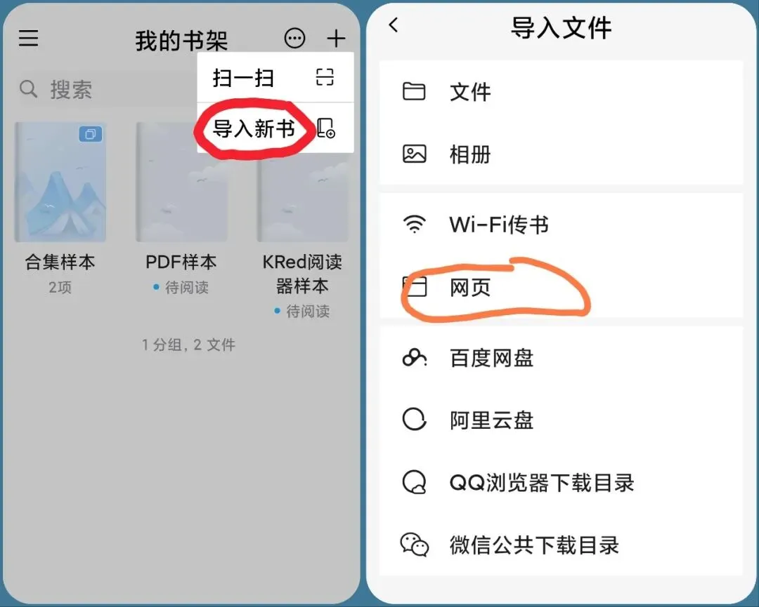 点击 App 右上角的「+」,选择「导入新书」里的「网页」选项,就能看到多个免费书站入口,还能直接搜全网。