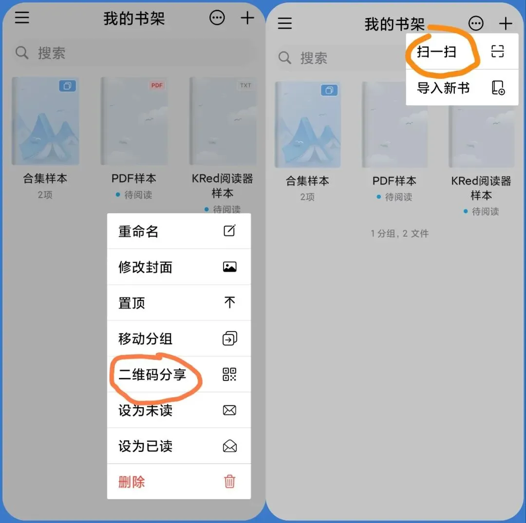 长按需要分享的书籍,选择「二维码分享」,生成二维码发给好友或另一设备,对方用同款 App 「扫一扫」,就能直接下载。