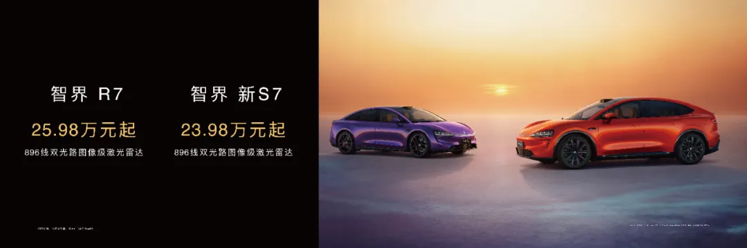 智界R7 896线双光路图像级激光雷达配置版官方建议零售价25.98万元起,智界新S7同配置版本23.98万元起;
