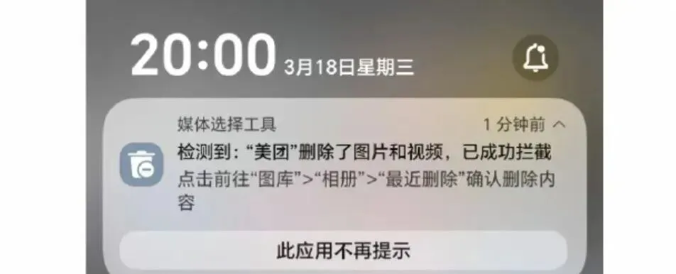 多地安卓用户爆料,手机弹出“检测到美团正在删除您的照片和视频”提示:有人点完外卖后近千张照片被清空,有人6年攒下的504G家庭影像被彻底删除,甚至一边恢复、后台一边删除,毫无反抗之力。