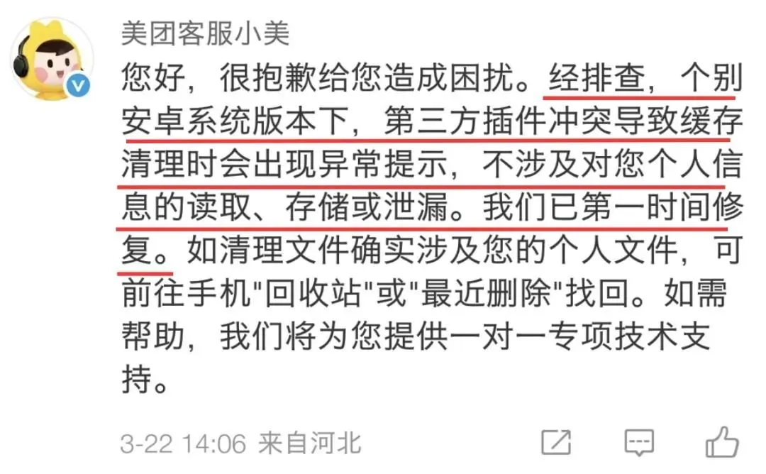 3月24日,美团回应称,此次异常是安卓系统极少数场景下,APP缓存清理与第三方SDK冲突,误将相册目录当作缓存删除,非主动越权,且未上传用户数据。
