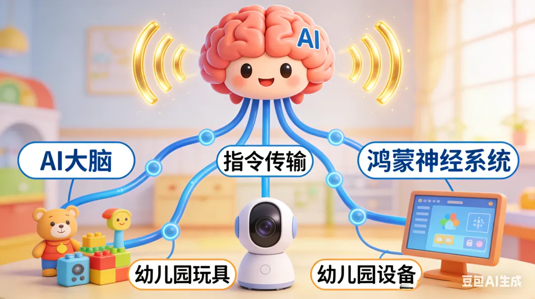 用一个通俗的比喻就能懂:如果把智慧幼儿园比作一个会思考、会响应的大活人,那么AI是“大脑”,负责分析、判断、出主意;鸿蒙是“神经系统”,负责传递信息、协同配合。