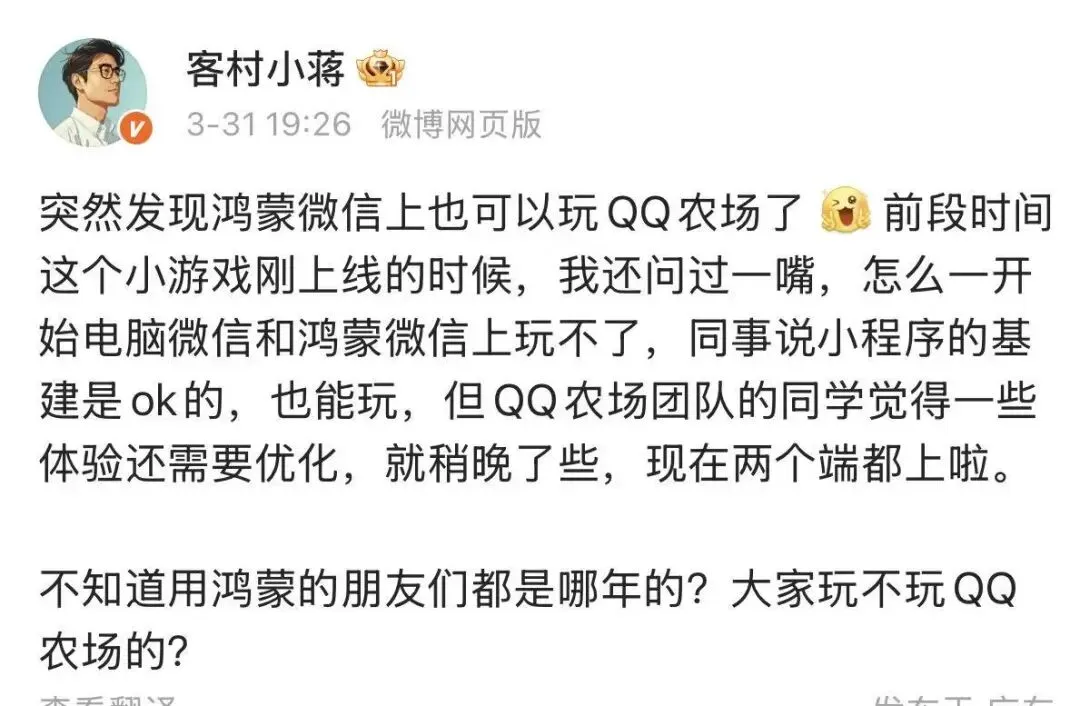 3月31日消息,腾讯员工称鸿蒙微信也可以玩QQ经典农场了。近日,
