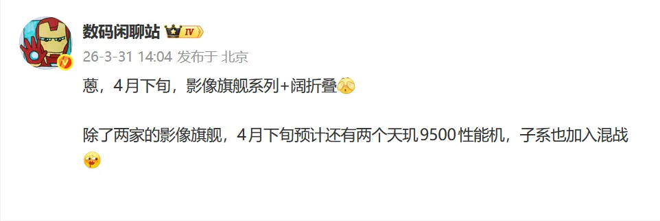 3月31日,数码博主@数码闲聊站 爆料,华为Pura 90系列与Pura X2将于4月下旬发布,暂定4.21登场,另有两款天玑9500性能机同期亮相,市场竞争激烈。