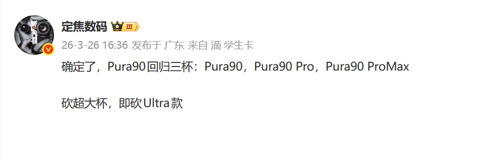 华为Pura 90系列精简为标准版、Pro版、Pro Max版,取消Pro+与Ultra版,定位更清晰。