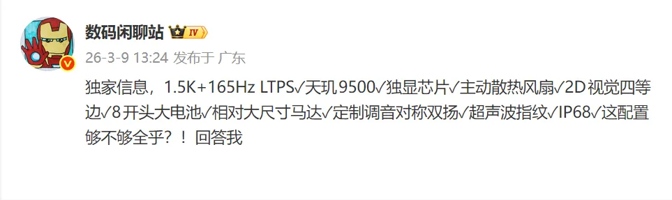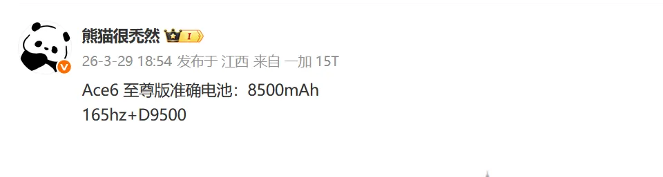 一加Ace6至尊版将搭载天玑9500芯片、8500mAh电池、165Hz高刷屏,主打性能与续航双优。
