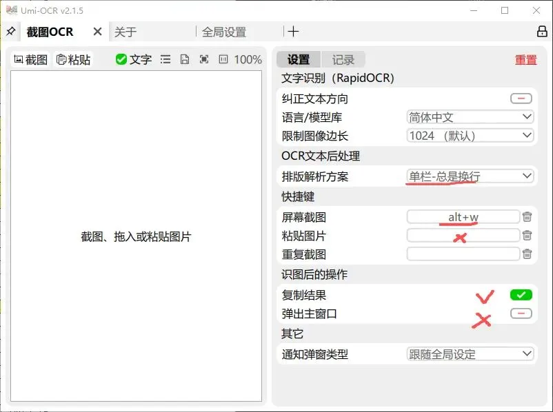 2.推荐只使用其OCR功能,快捷键推荐使用alt+W。按下图设置