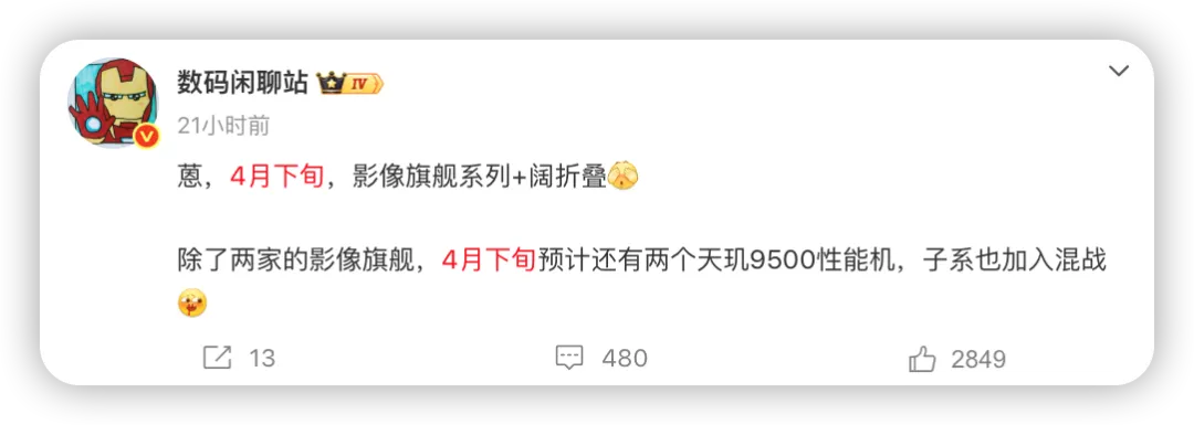博主 @数码闲聊站最新透露,某厂的影像旗舰系列 + 阔折叠新机将在 4 月下旬亮相。