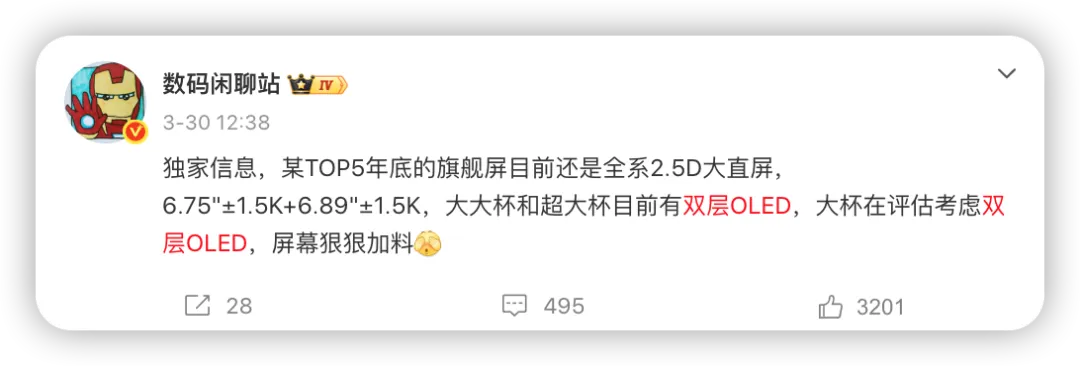 该博主表示,某 TOP5 厂商的旗舰系列将全系采用 2.5D 大直屏。