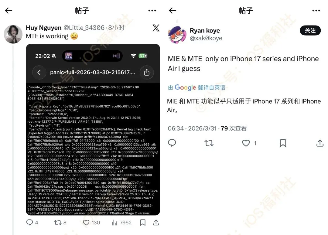 据悉,MTE 是 ARMv8.5 的一项硬件级内存安全技术,苹果从 A19 芯片中使用。它会对内存分配分配随机标签,自动校验是否匹配;此举可将漏洞利用成功率降低多达 70%。