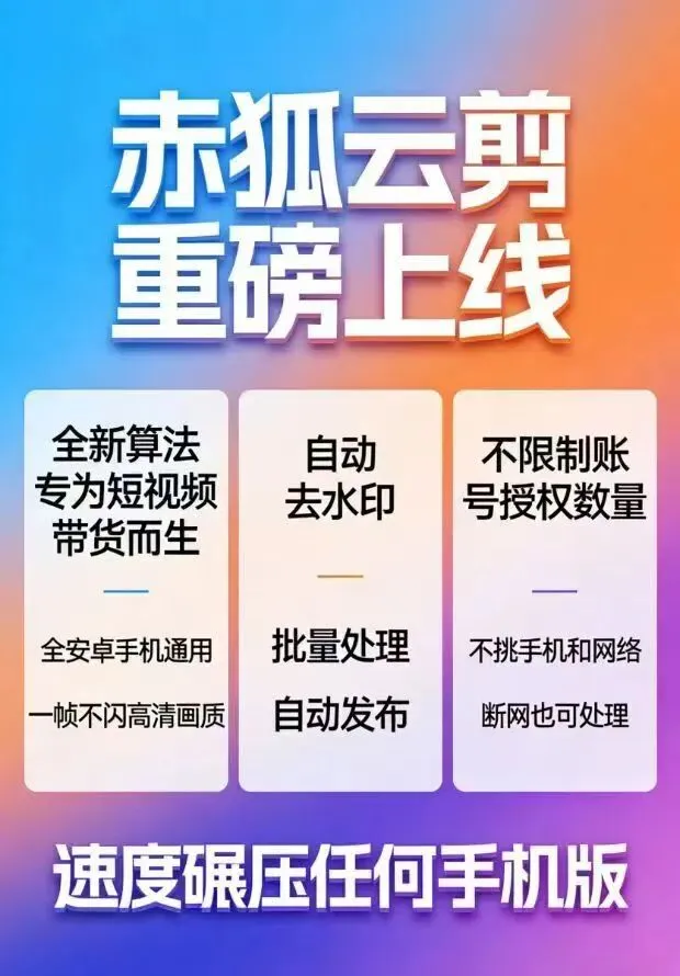 赤狐云剪安卓批量版,断网能用、一帧不闪、不限时长、不限账号,去重、去水印、发布一站式解决,矩阵运营懒人必备,让你轻松跑量、快速起号、稳定变现!