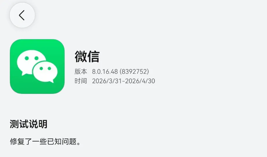 微信鸿蒙版上线测试版8.0.16.48,测试说明:修复了一些已知问题。