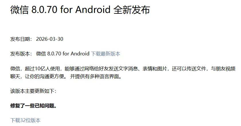 微信安卓版已经于2026-3-30上线8.0.70正式版本。