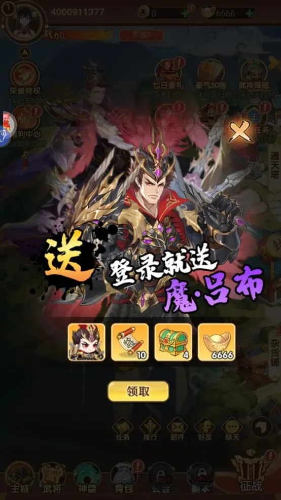 开局就可以获得魔将吕布,再加上升级连抽,轻松称霸三国战场