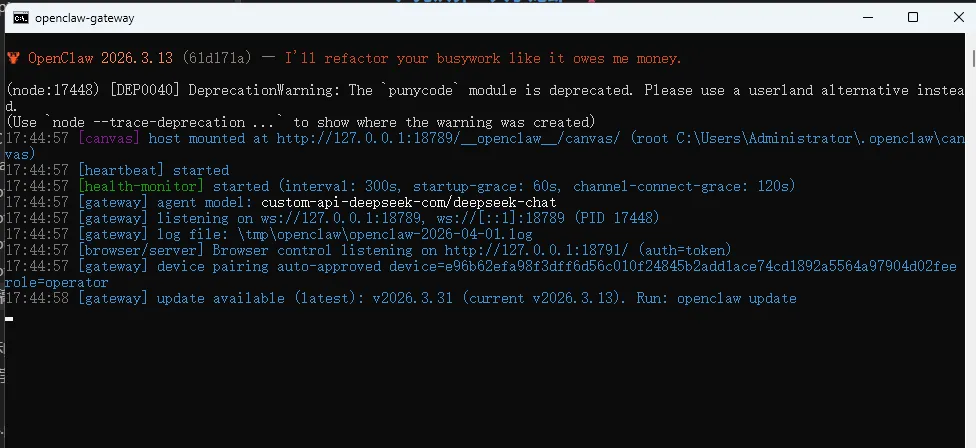 之后你会看到一个小龙虾窗口跳出来,这就是 OpenClaw 的 Gateway 了,说明你的小龙虾正在运行中!