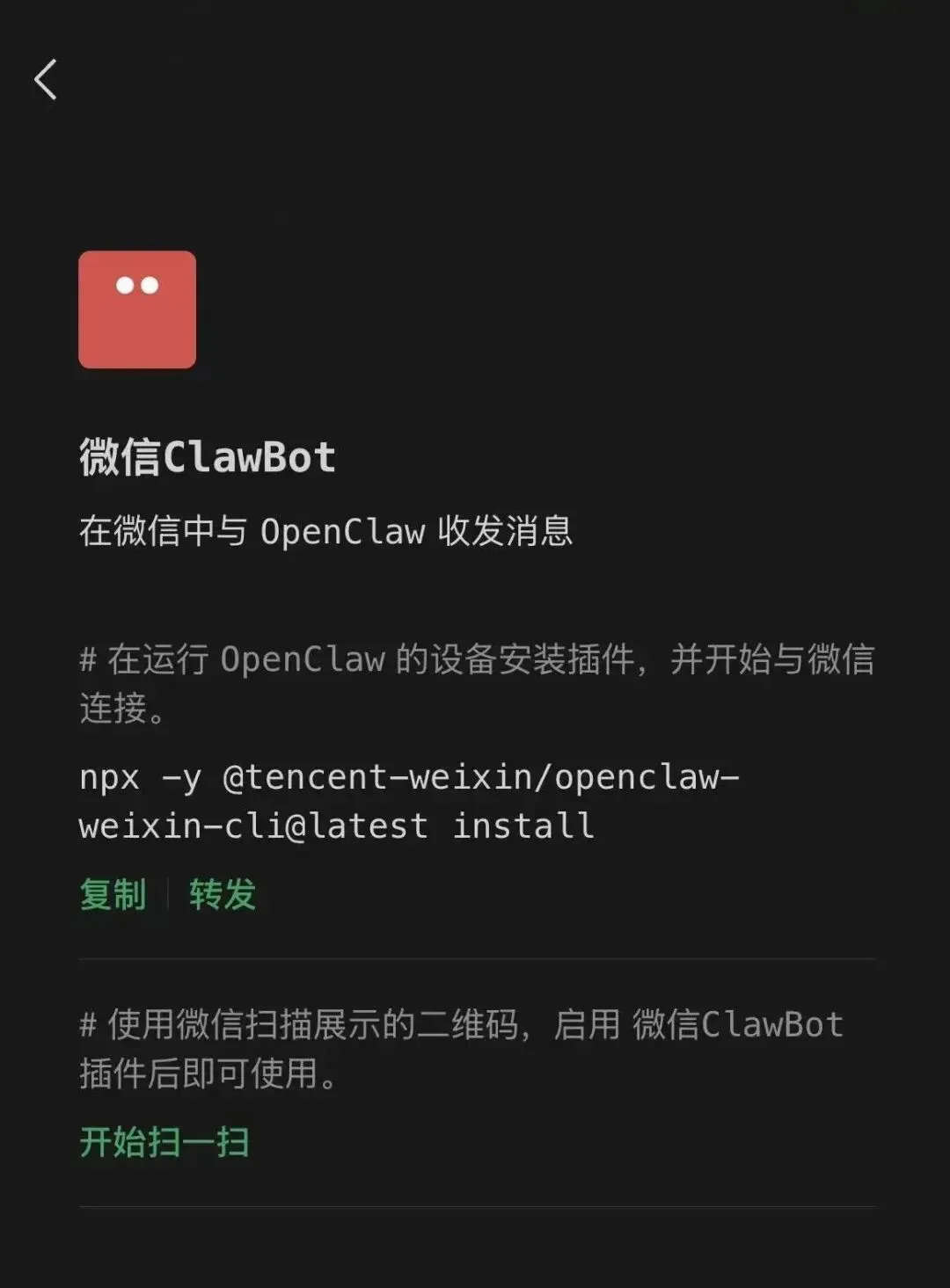 npx -y @tencent-weixin/openclaw-weixin-cli@latest install