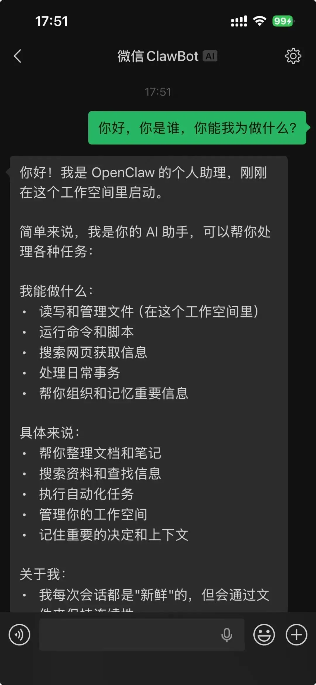 亲自试了一把,只能说:太香了! 在微信里跟小龙虾聊天、发图片、下任务,流畅得不像话~