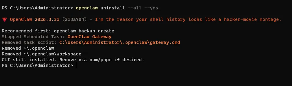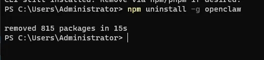openclaw uninstall --all --yesnpm uninstall -g openclaw