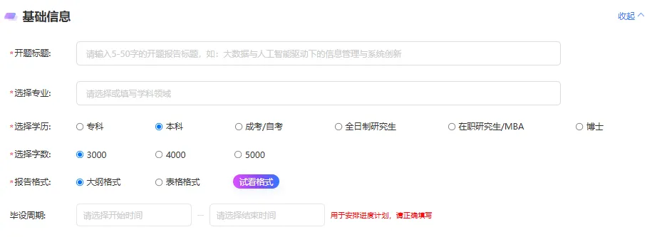 ②填写基本信息:标题、所属专业、学历层次(本科/硕士/博士等)、预期字数等;
