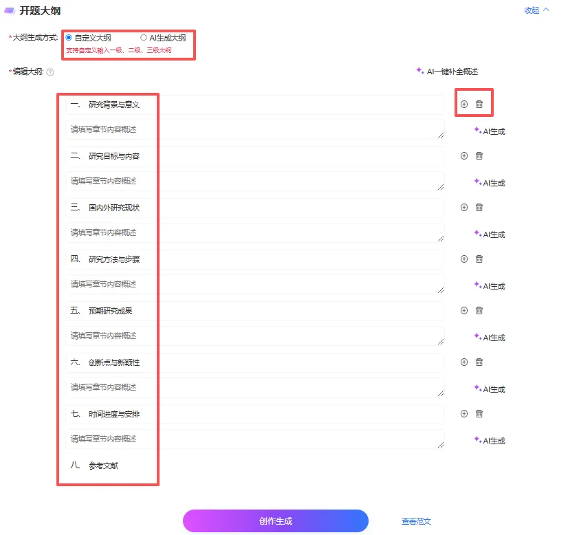 你可以让ai免费生成大纲,也能把和导师定好的框架输进去,还能随时增删修改。