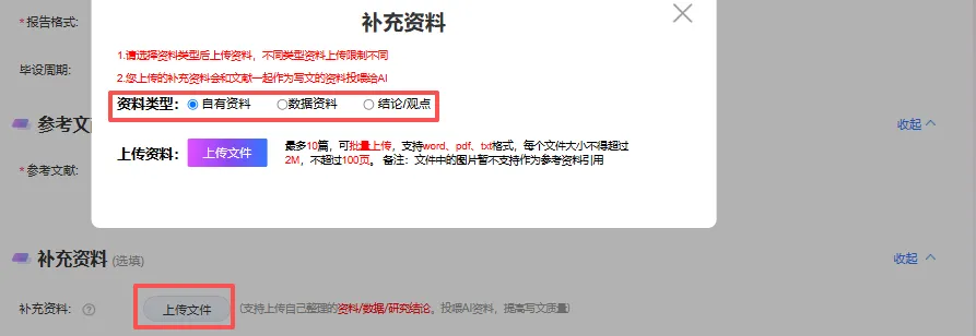 咱们平时做的预实验数据、调研结果,还有导师给的研究思路,都能传上去让ai参考。