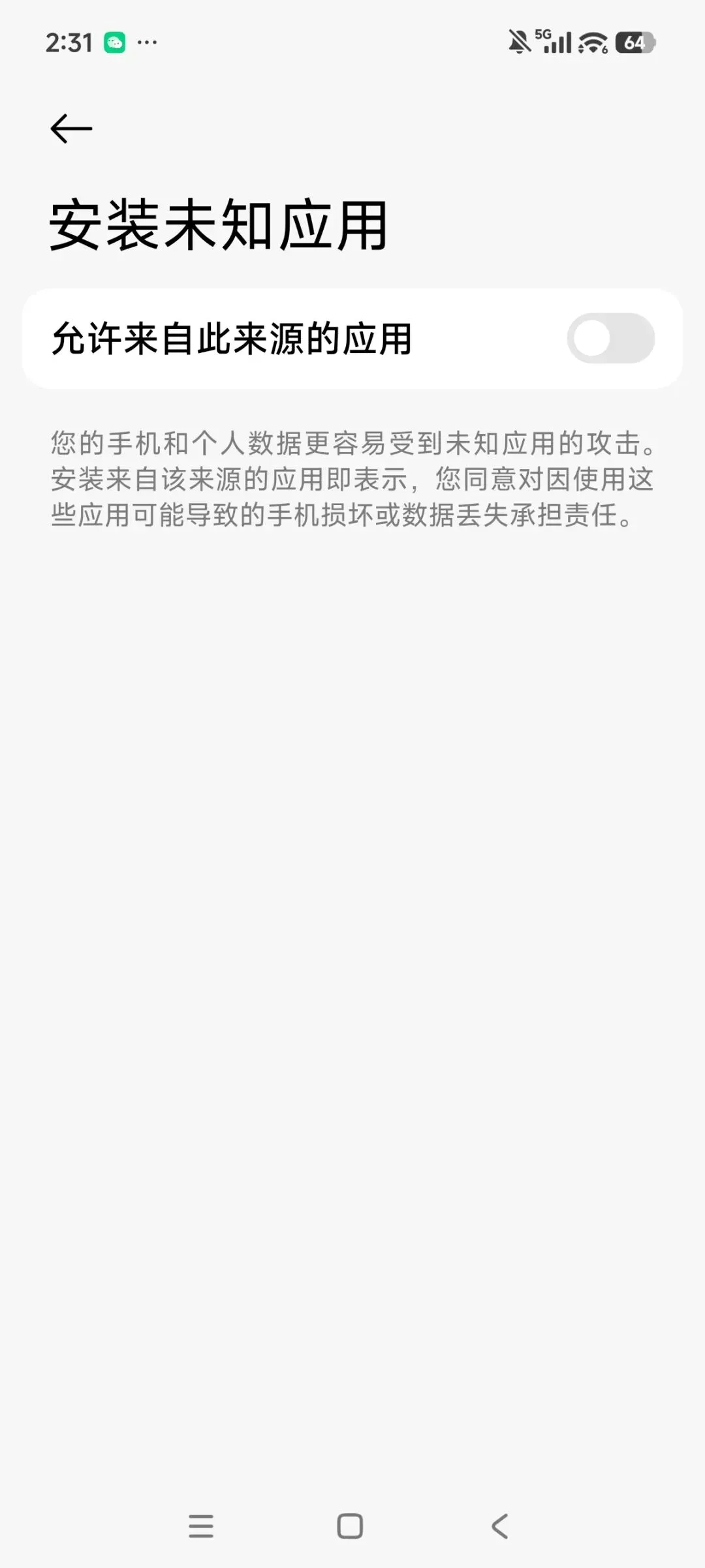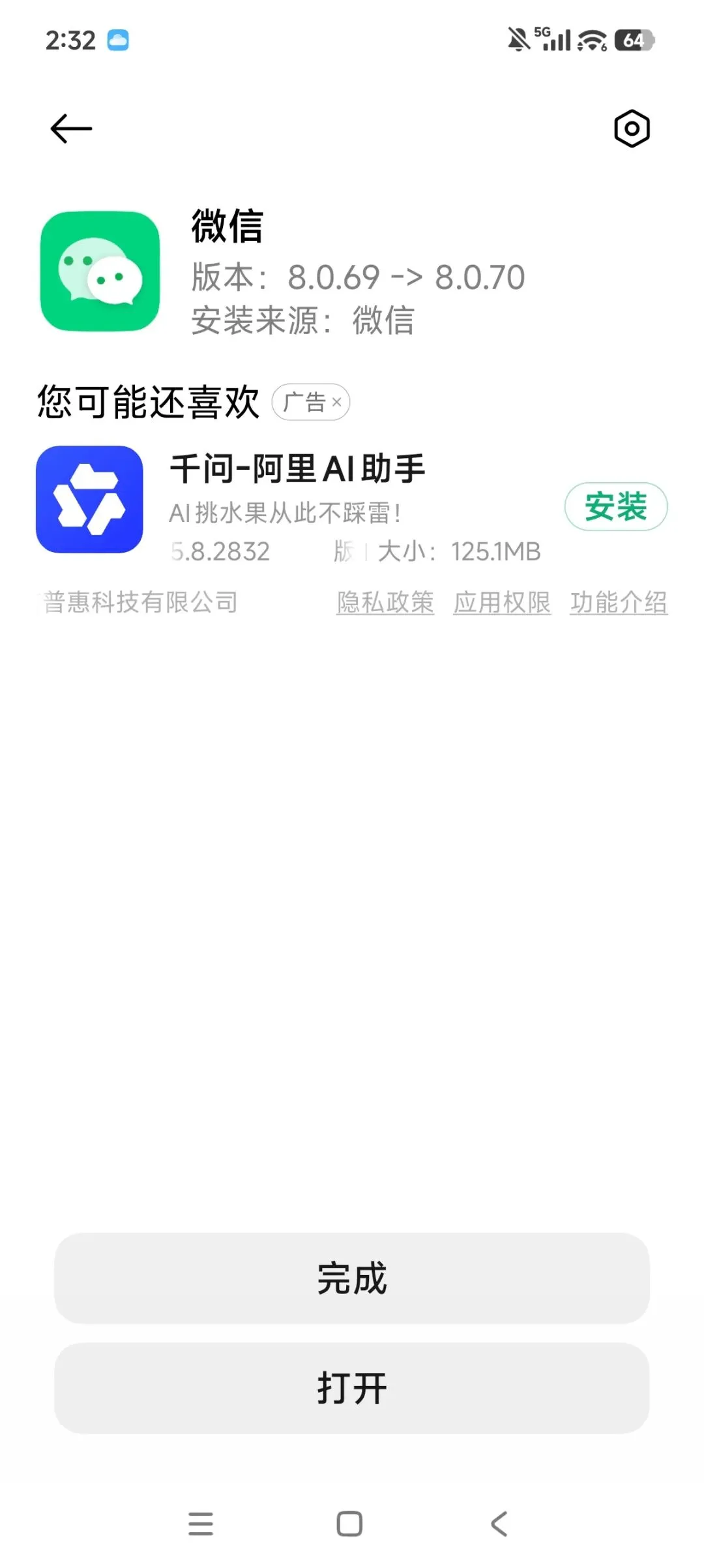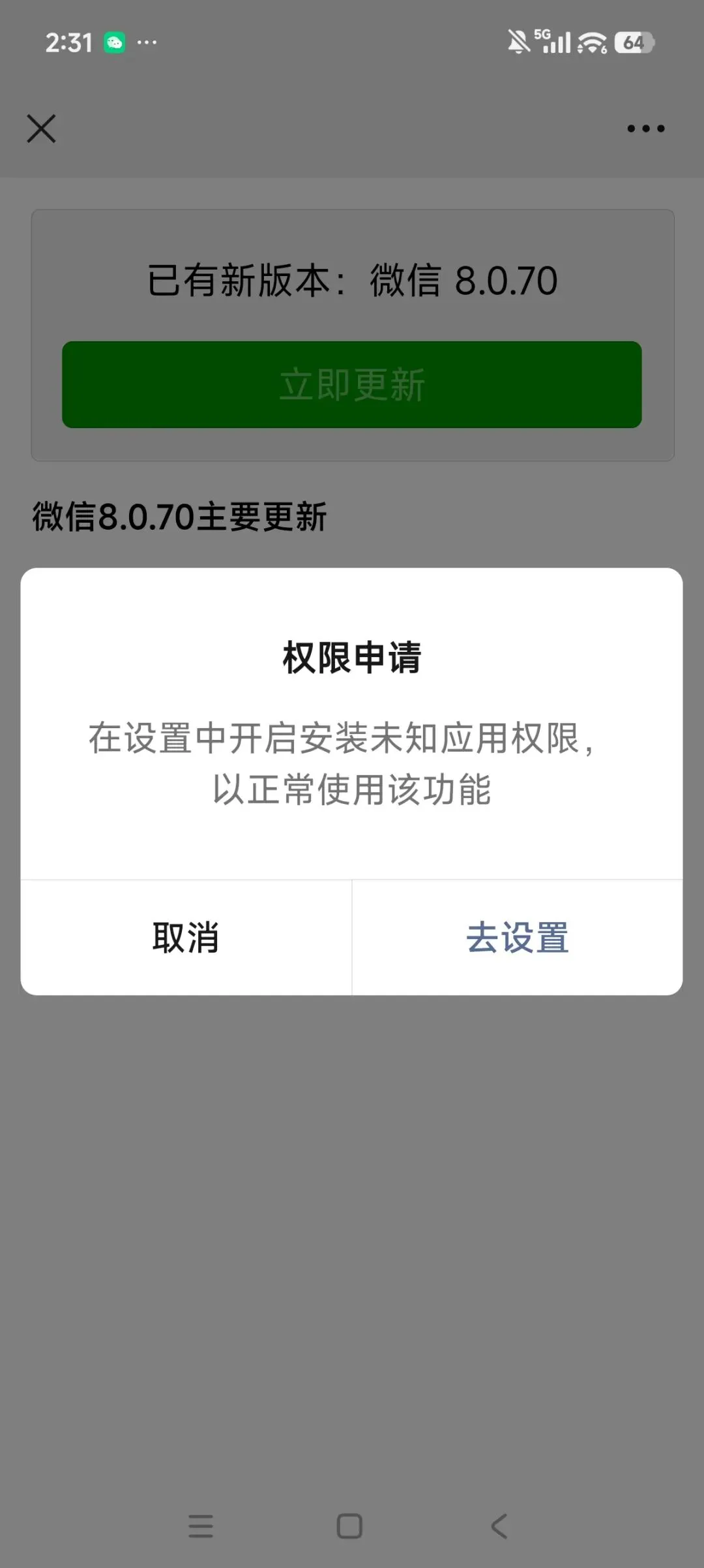 在“权限申请”界面,点击“去设置”按钮,打开界面如下:点击“允许来自此来源的应用”,灰色按钮变绿色,继续,安装完成:点击打开,重新打开微信,再次找到“关于微信”菜单,版本号已经显示8.0.70。