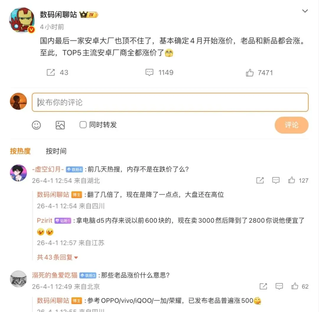 昨天,信息源 @数码闲聊站 在微博发布消息,国内 TOP 5 主流安卓厂商已全部确认涨价,「最后一家大厂」亦于 4 月起跟进调价,涨价范围覆盖新品与老品,手机、平板均在此列。针对「内存近期不是在跌价?」的质疑,该博主回应称,内存价格此前已翻了几倍,目前虽有小幅回落,但整体大盘仍处于高位。对于「老品涨价」的具体含义,该博主以 OPPO、vivo、iQOO、一加、荣耀为例,指出上述品牌已发布的老款机型普遍涨价 500 元。原特斯拉中国区总经理孔艳双加盟小米,接手汽车销售业务