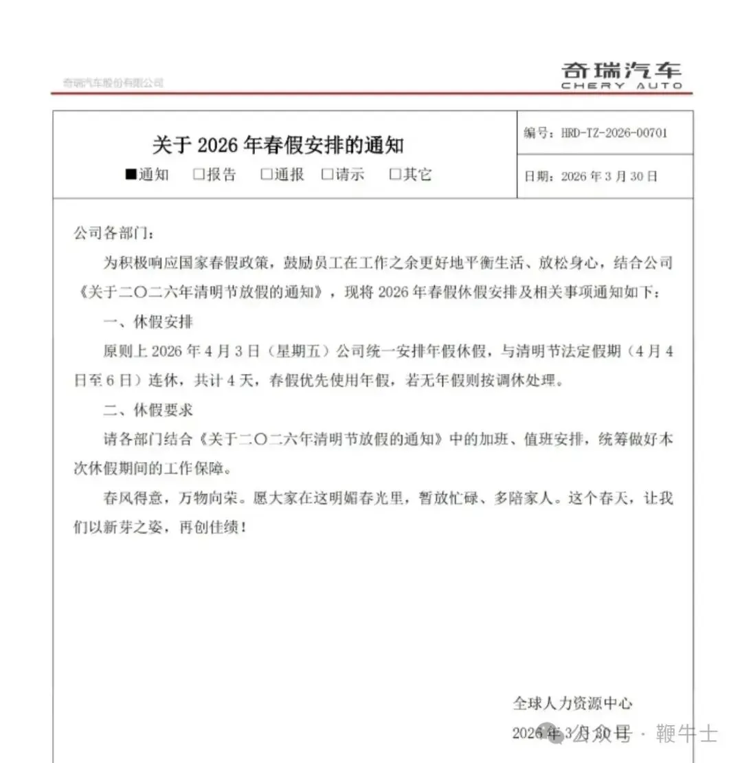 据鞭牛士报道,奇瑞汽车进日发布内部通知,宣布将 2026 年 4 月 3 日统一安排为春假休假日,与随后的清明节法定假期(4 月 4 日至 6 日)连休,共计形成 4 天长假。通知称,此举旨在积极响应国家春假政策,鼓励员工在工作之余更好地平衡生活、放松身心。然而,通知同时明确,春假优先使用员工个人年假额度,若员工已无年假则按调休处理。值得关注的是,奇瑞汽车此前曾因加班文化问题受到舆论质疑。奇瑞董事长尹同跃曾在集团大会上公开鞠躬致歉,并随即推出被称为「三条铁律」的管理改革措施:严格禁止在周末及周六组织公司级会议、明确保障异地员工与家庭团聚的时间,以及大幅精简会议数量与参会人数。腾讯全系「龙虾」产品首批通过信通院 OpenClaw 基线能力评估
