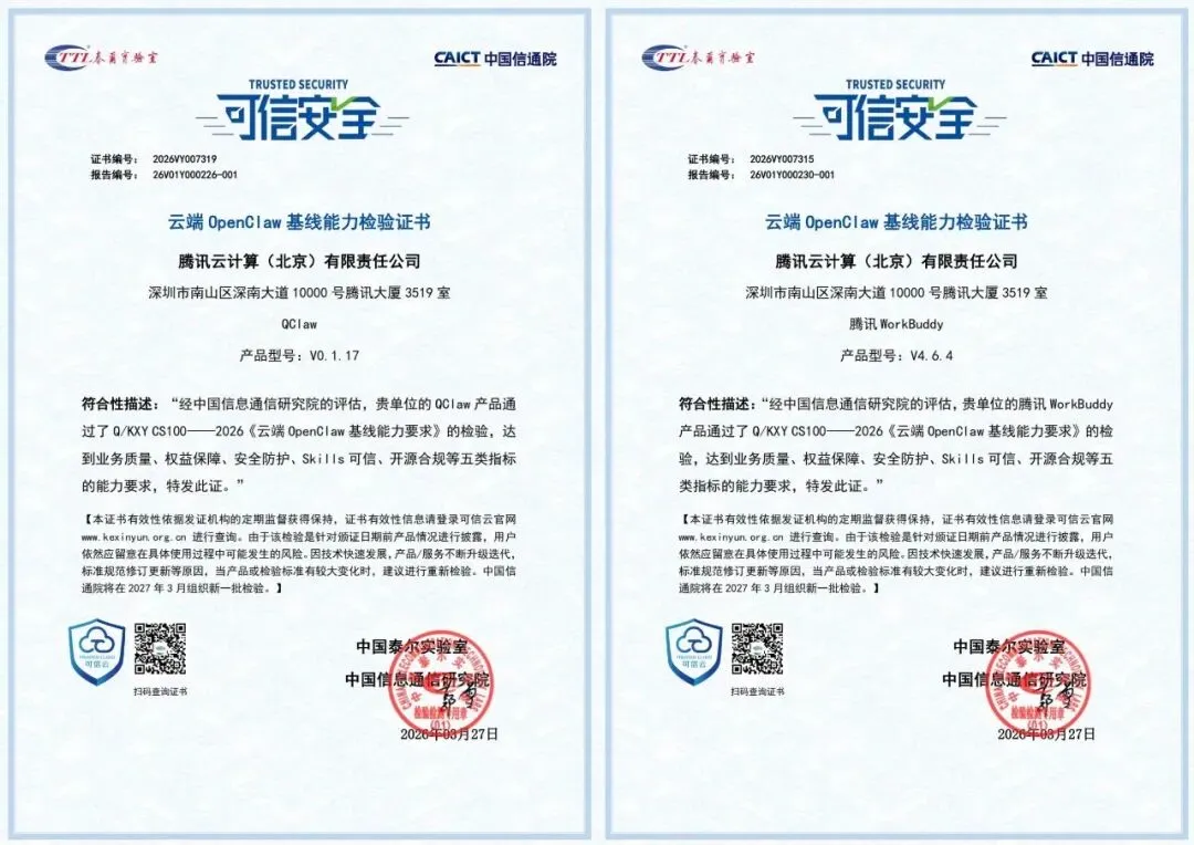 4 月 1 日,中国信息通信研究院公布「云端 OpenClaw 基线能力评估」结果,腾讯旗下 WorkBuddy、QClaw、轻量云 OpenClaw、云桌面云手机 Claw 及 ClawPro 五款产品首批通过评估。针对 OpenClaw 存在的权限失控、数据泄露和成本不可控等潜在安全风险问题,中国信通院聚焦产业转型痛点与技术升级需求,牵头撰写《云端 OpenClaw 基线能力要求》标准,并围绕「功能可信」「收费可控」「权限可靠」「来源可溯」「能力可管」五大核心维度开展系统性评估。此次通过评估,意味着腾讯全系「龙虾」产品全面达到上述国家级标准要求。广州警方颁布无人机新规