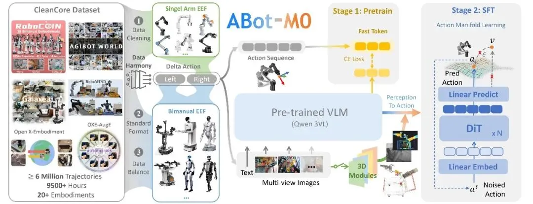 高德日前宣布正式全量开源 ABot-M0,这是全球首个基于统一架构的机器人具身操作基座模型,核心理念为「一个通用大脑适配多种形态的具身机器人」。ABot-M0 在 Libero、Libero-Plus、RoboCasa、RoboTwin 2.0 等多个权威基准测试中均达到 SOTA 水平。其中在 Libero-Plus 基准上,任务成功率达 80.5%,较此前业界标杆方案 Pi0 提升近 30%;在 LIBERO 基准上,平均成功率达 98.6%,超越 X-VLA、GR00T-N1.6 等竞争方案。此次开源覆盖数据、算法、模型三大维度,并同步发布项目论文《ABot-M0: VLA Foundation Model for Robotic Manipulation with Action Manifold Learning》。💻 GitHub: https://github.com/amap-cvlab/ABot-Manipulation 📄 论文全文:https://arxiv.org/pdf/2602.11236广州早茶新规正式公布:茶位费必须配茶、传统点心须 24 小时内现制