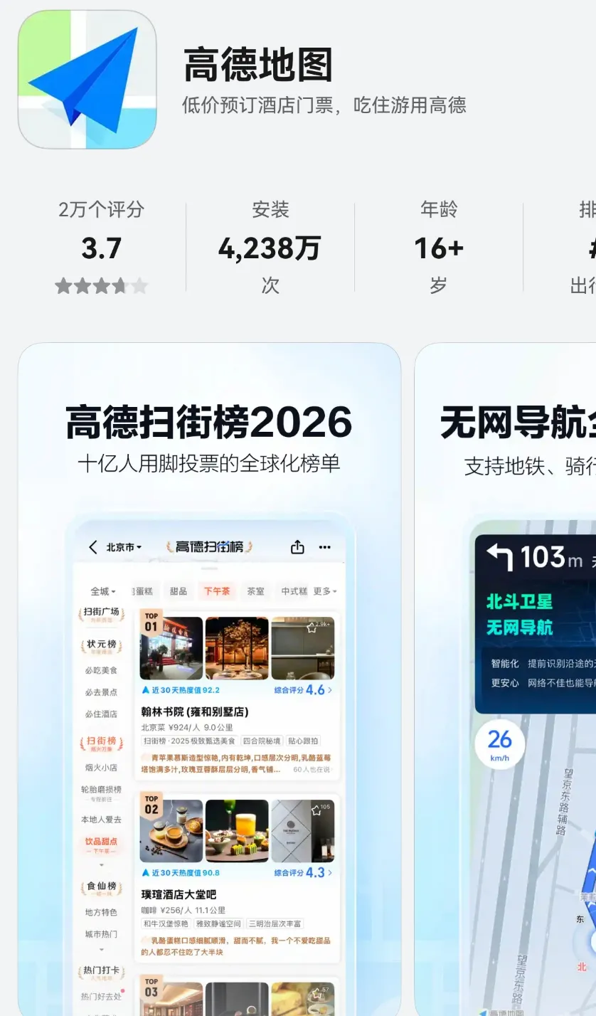 -高德扫街榜2026 十亿人用脚投票的全球化榜单-无网导航全场景覆盖,支持地铁、骑行、步行等全场景-地标AI步导首发,播报真实地标 指引不迷路-云控红绿灯首发,联合北京交警,减少通行等待-深色模式新体验,夜间使用更护眼