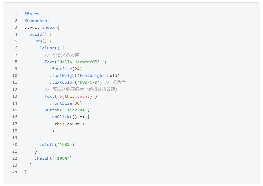 环境搭好后,我们来写一个简单的“Hello HarmonyOS”应用,新手跟着复制代码,就能在模拟器上运行,成就感拉满👇