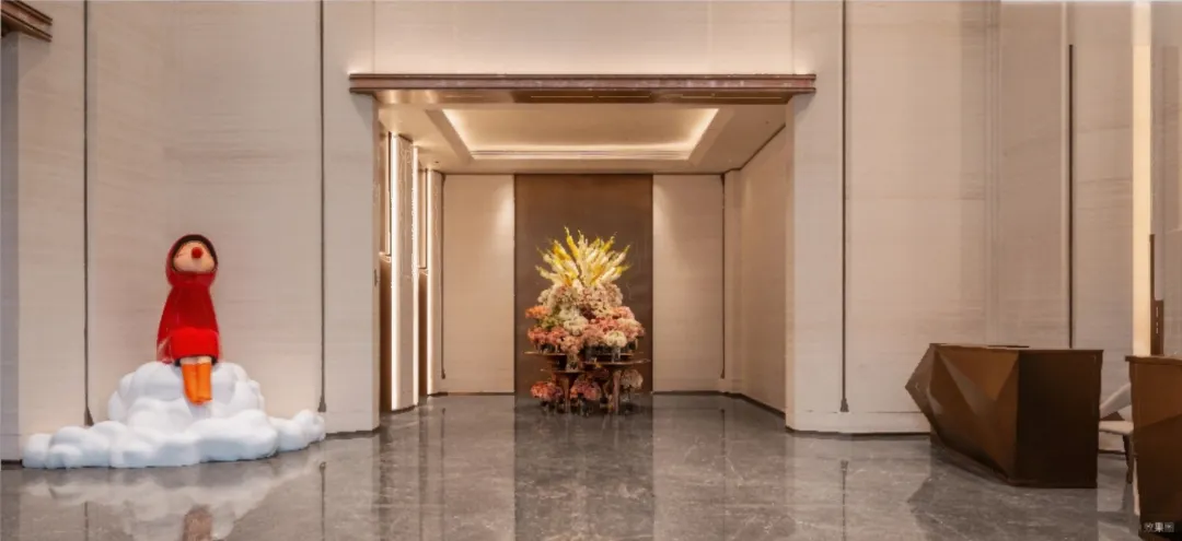大堂用了贝金米黄奢石、古铜花柱、巴西安第斯雪景大理石等名贵石材,水吧台以“阿富汗粉玉+钻石切割吊顶”形成艺术效果,未来是业主的“艺术会客厅”。
