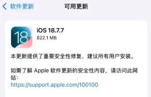 iOS 18.7.7 正式版更新是一次安全性的更新,苹果建议所有用户安装。