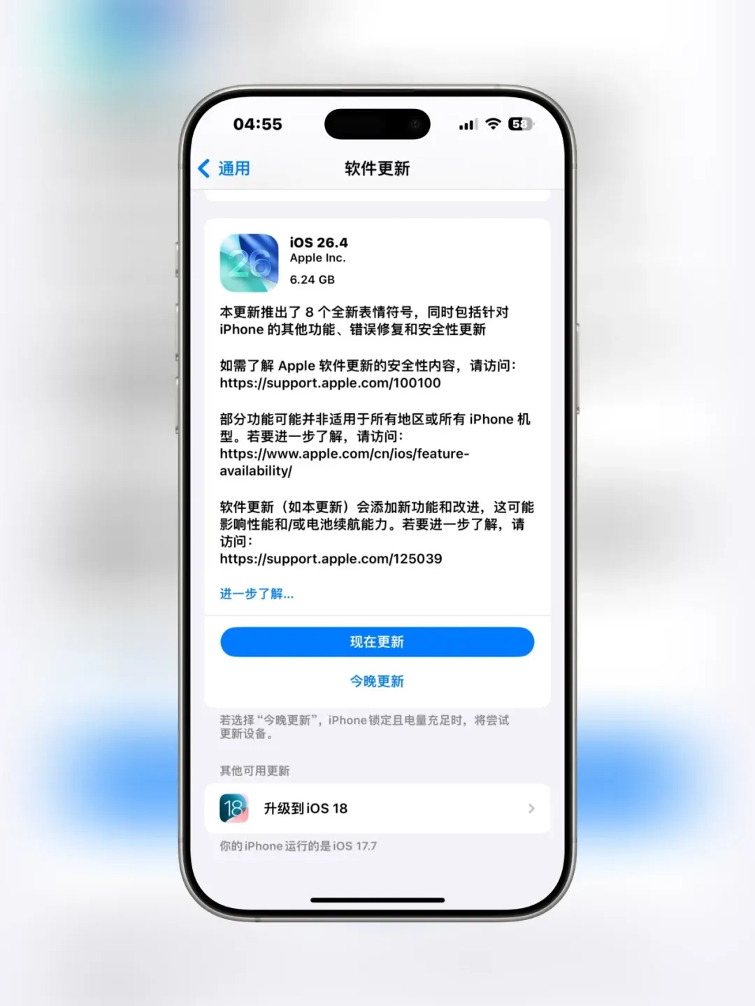 今日凌晨突然推送了 iOS 18.7.7正式版更新,版本号: