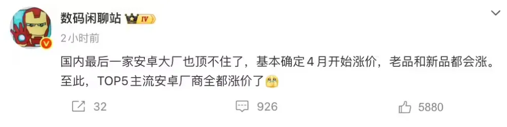 发文,称国内最后一家安卓大厂也顶不住了,基本确定 4 月开始涨价,老品和新品都会涨。至此,TOP5 主流安卓厂商全都涨价。