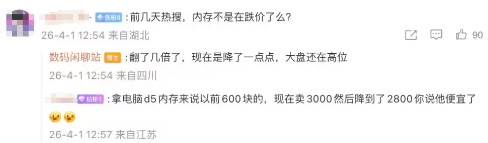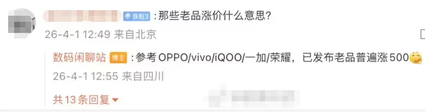 评论区有用户询问“前几天热搜,内存不是在跌价了么?”,对此该博主回应称“翻了几倍了,现在是降了一点点,大盘还在高位”。还有用户询问“老品涨价是什么意思?”,该博主回应称“参考 OPPO / vivo / iQOO / 一加 / 荣耀,已发布老品普遍涨 500”。
