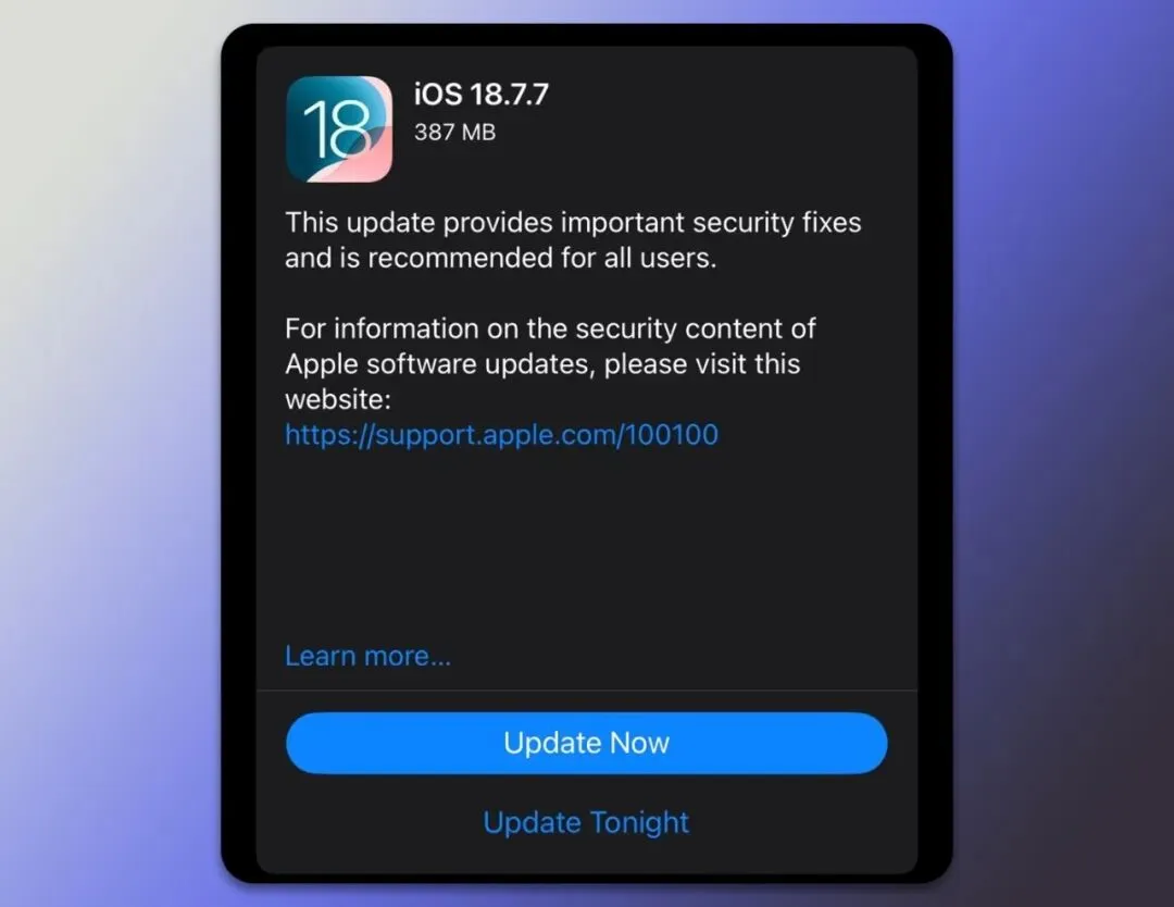 在 iOS 18.7.7 中提供了重要的安全性修复,苹果建议所有用户安装,主是修复了 DarkSword 漏洞,更新可免受目前流传的恶意网站和链接的侵害。