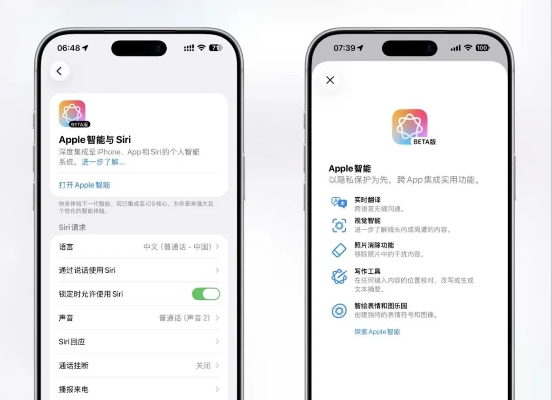 虽然功能没咋变,但凌晨那会儿确实出了个大新闻,很多iPhone 15 Pro及以上机型的用户发现,设置里的Siri居然悄悄变身成了Apple 智能与 Siri,这事儿挺有意思,像是苹果不小心开了个后门,让部分国行设备提前体验了一把实时翻译、视觉智能、照片消除这些眼馋已久的功能,甚至连智绘表情和图乐园都能跑起来了,这波深夜福利确实让熬夜的果粉爽到了