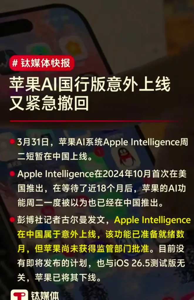 不太对劲在哪,国行系统里能看到完整的Apple Intelligence,这个名字从2024年开发者大会亮过一次,大家就一直盼着落地到本地版本,苹果那时说要做本地合规的适配,要多一些时间,生成式AI那会正当红,这个承诺就成了很多中国iPhone用户最期待的功能之一,生态里也出现了一个时差,全球多地已经用了大半年,国行这边迟迟没定,