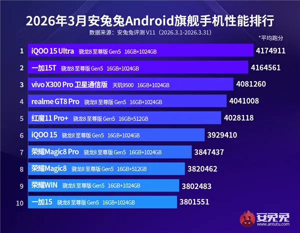 4月2日,安兔兔发布2026年3月安卓设备性能榜单。在旗舰手机性能榜中,骁龙8至尊版Gen5成为主流配置,iQOO 15 Ultra凭借4174911的平均跑分位列第一;6.3英寸小屏旗舰一加15T以4164561的平均跑分排名第二;vivo X300 Pro卫星通信版搭载天玑9500位列第三。realme GT8 Pro排位第四。段永平系列(OPPO 系和 vivo 系列)包揽前四。