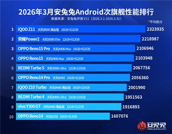 发布的次旗舰榜单方面,iQOO Z11搭载天玑8500满血版,以2323935的平均分夺冠,荣耀Power2和OPPO Reno15 Pro分列二、三位。安兔兔强调,榜单数据取自当月全部跑分数据的平均分,且仅收录有效跑分超1000次的机型。受温度、系统版本等因素影响,榜单成绩仅作性能参考。