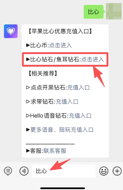 2、在公众号对话框中回复“比心”,系统会自动回复优惠入口,点击进入。
