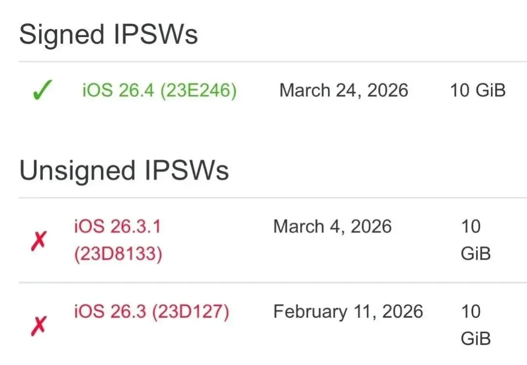 苹果刚刚正式关闭 iOS 26.3.1 正式版 验证通道,这意味着已升级至 iOS 26.4 正式版 / 26.4 测试版 的用户,无法再降级回 26.3.1。