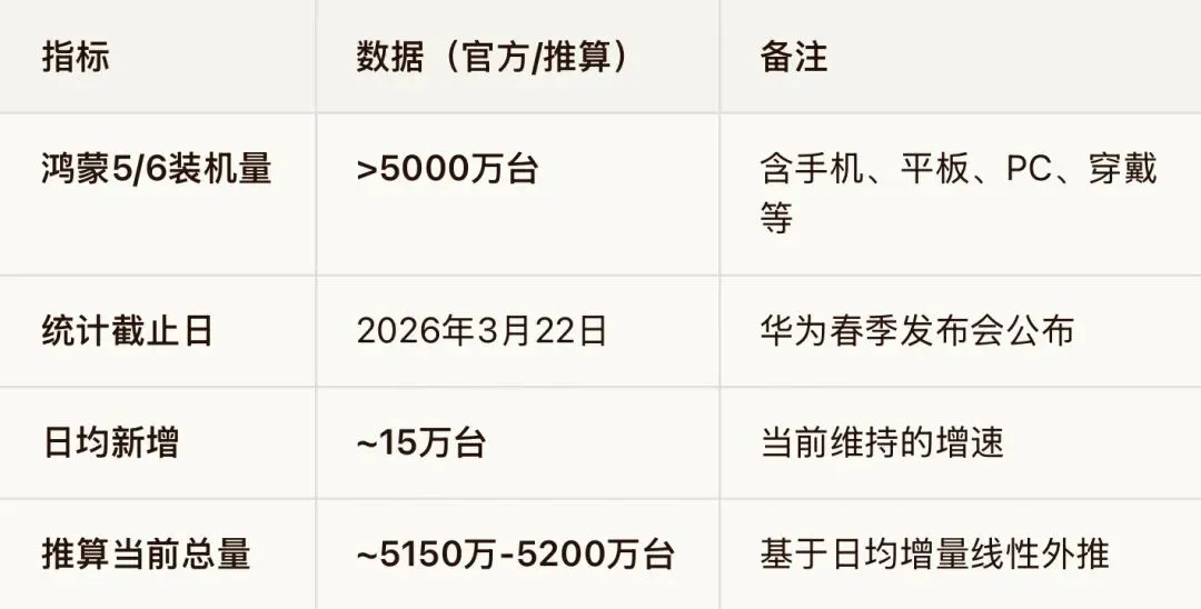 截至2026年4月3日,华为官方最新口径(3月23日春季发布会)显示:搭载 HarmonyOS 5 及 HarmonyOS 6 的终端设备数已突破 5000 万台。