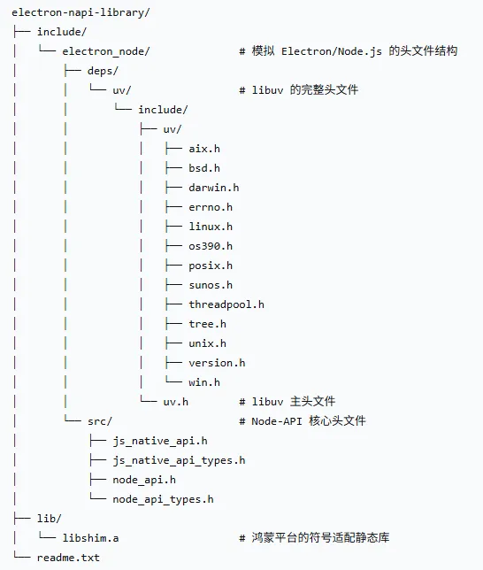 electron-napi-library 文件夹是鸿蒙平台上 Electron 与 N-API 原生模块之间的适配层。它解决了在鸿蒙(OpenHarmony)系统上运行 Electron 应用时,原生模块(如 node-sqlite3)的兼容性问题。将 Electron/Node.js 的完整头文件体系(特别是 libuv 和 Node-API)重新组织后,与 libshim.a 一起提供的一个适配包。