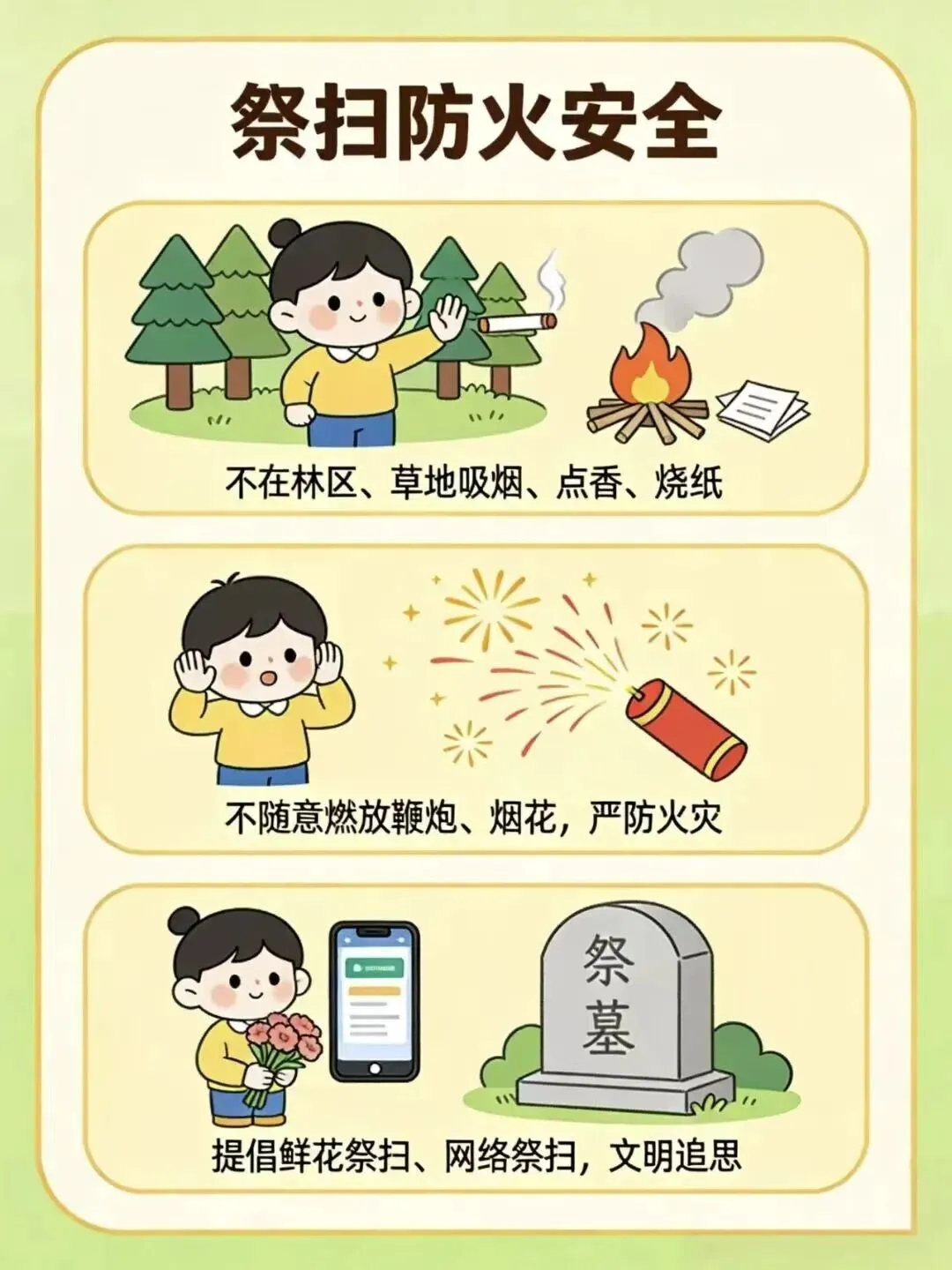 祭扫踏青时如需使用火源,应远离草木、杂物等易燃物品,用火时全程有人看管,结束后彻底浇灭余烬,确认无复燃风险再离开。严禁在山林、草坪等防火区域违规用火、焚烧祭品及燃放烟花爆竹。